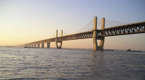 蕪湖長江大橋是國家"九五"重點(diǎn)交通項(xiàng)目,其橋型為公、鐵兩用鋼桁梁斜拉橋,鐵路為I級,雙線;公路為4車道,車行道寬18米,兩側(cè)人行道各寬1.5米。公路在上層,鐵路在下層。鐵路橋長10616米,公路橋長6078米,其中跨江橋長2193.7米。它于1997年3月22日正式開工,2000年9月建成通車。